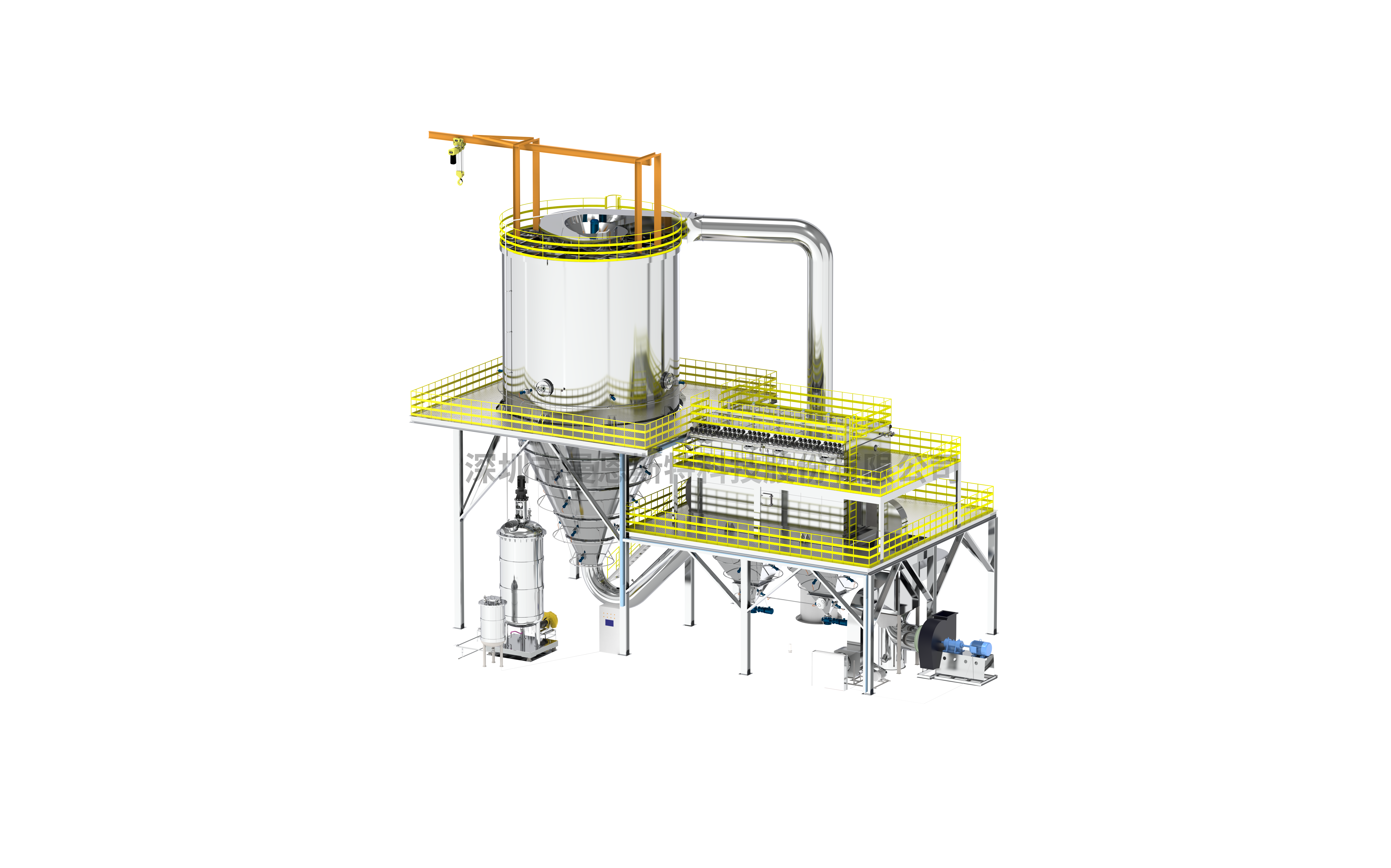 The New Generation Spray Dryer UnitNatural air is first filtered through an air filter, then blown by a fan into a waste heat recovery unit for heat exchange. After being preheated by waste heat, the air is heated to the required temperature by a heater before entering the main tower and the hot air distributor. Under the action of the adjustable hot air distributor, the air uniformly enters the tower in a spiral pattern through the hot air duct. Both the hot air duct and the distributor blades are coated with a protective layer to prevent the introduction of metallic impurities. Meanwhile, the material liquid undergoes demagnetization and filtration before being pumped into our self-developed high-speed centrifugal atomizer for dispersion.Detailed Introduction