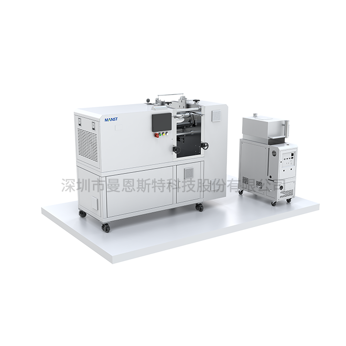 Four-Roll Film Forming MachineThe Four-Roll Experimental Film Formation & Thinning Machine is an integrated equipment used in dry process technology for film formation, thinning, and thermal lamination of electrode and electrolyte composite powders onto current collectors. It mainly consists of a frame unit, a roll pressing unit, and a gap adjustment unit. During operation, the electrode powder mixture passes through multiple heated rolls, where it is progressively calendered into a continuous film with precise thickness control, and is finnally thermally bonded onto the current collector.